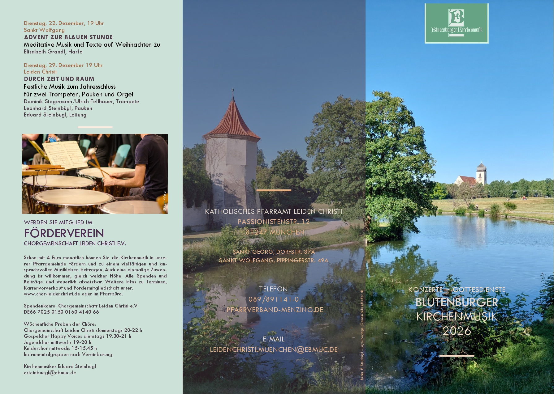 • 22.11.2026, 17 h, Pfarrkirche Leiden Christi: Herbstkonzert der Chorgemeinschaft: „Messias“ von Händel | Karten über Rubrik „Tickets“ hier auf der Homepage oder im Pfarrbüro Leiden Christi, Passionistenstr. 12, 81247 München (nur Barzahlung); Öffnungzeiten Pfarrbüro: Mo – Fr 8 h – 12 h, zusätzlich Di/Mi 14 h – 17 h, zusätzlich Do 14 h – 18 h | Kartenvorverkauf ca. ab Spätsommer 2026